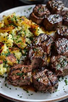 Kawałki steka z masłem czosnkowym i tłuczone ziemniaki z serem
