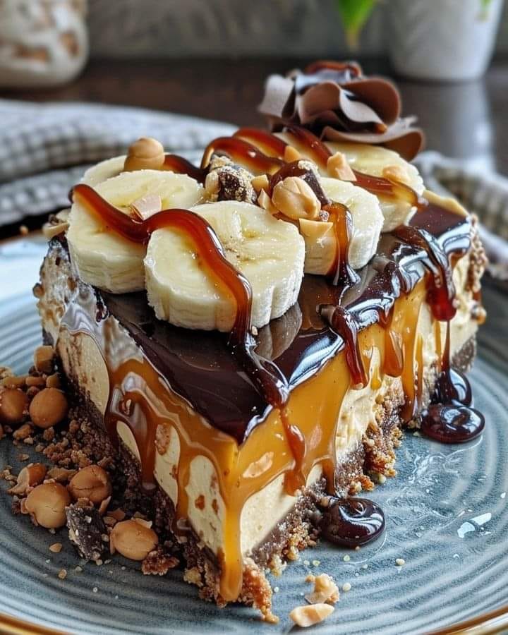 Sernik bananowo-karmelowo-orzechowy 🍌🍯🥜 Rozkoszuj się tym luksusowym sernikiem bananowo-karmelowo-orzechowym, łączącym kremowe nadzienie z masłem orzechowym z bogatą warstwą karmelu, zwieńczonym świeżymi bananami i posiekanymi orzeszkami ziemnymi. Wykwintny deser na każdą specjalną okazję! Składniki: